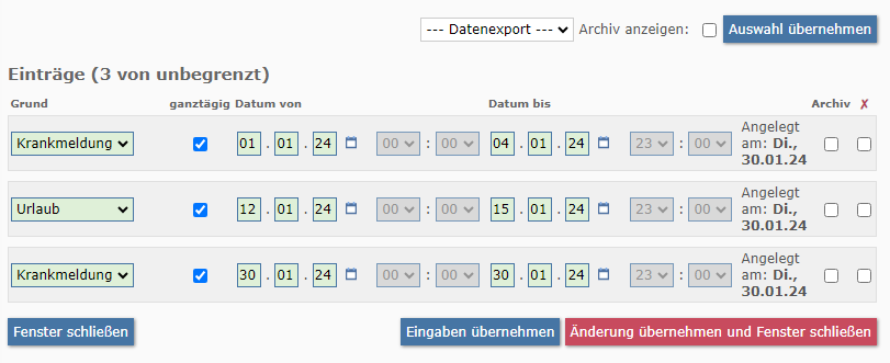 In dem internen Bereich, lassen sich ebenso exakte Zeiträume für Urlaube angeben.